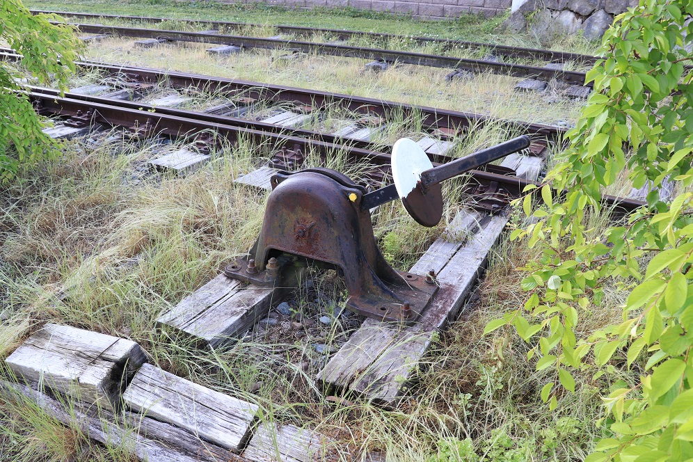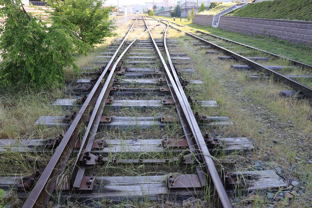 ここは、かつての屋代線の路盤跡を再整備して、公園として解放している場所です。園内にはかつての引き込み線の線路がそのまま残されており、レールのほかポイントや車庫も見ることができます。ちなみに本線のレールはすでに撤去されており、本線跡は砂利敷きの遊歩道のようになっています。