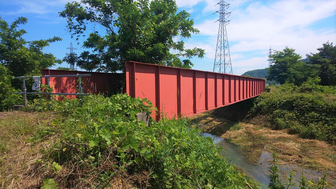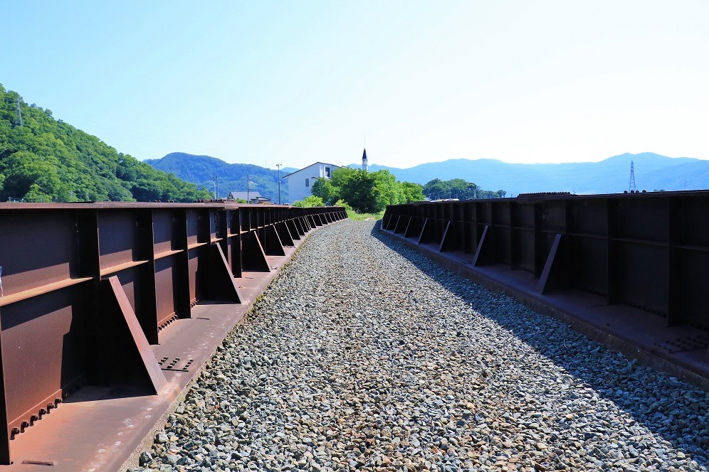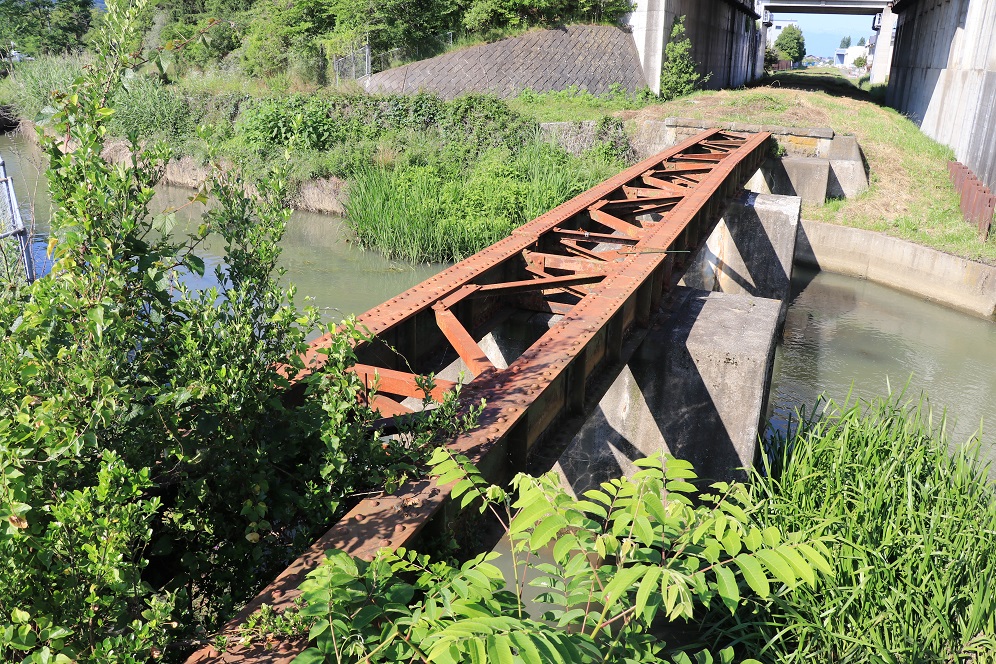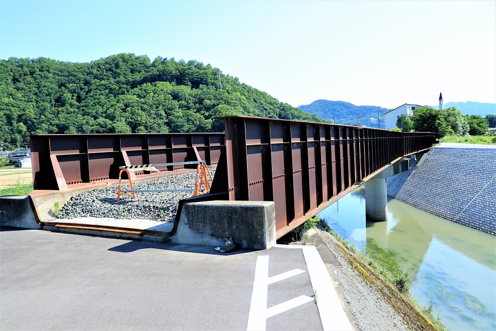 こうした廃線跡では橋の跡というと、せいぜい解体の難しい橋台や橋脚だけが残されることが多かったりするのですが、ここはしっかりと橋桁までが残されています。そのため、往時の雰囲気を偲ばせてくれること間違いありません。