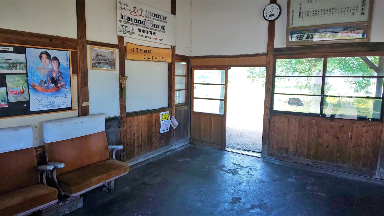 若穂駅の次は、旧屋代線遺構の中でも目玉のひとつとなる「信濃川田駅」です。この駅は、廃止当時の駅舎が現在でも残っていて、しかもそれが今でもバスの待合所として使われています。バス用ということではありますが、現役の駅舎となりますので当然、建物の中に自由に立ち入ることができ、風情ある木造駅舎の佇まいを存分に味わうことができるようになっています(屋根の塗装や壁の漆喰など、最低限の補修はなされているようです)。
