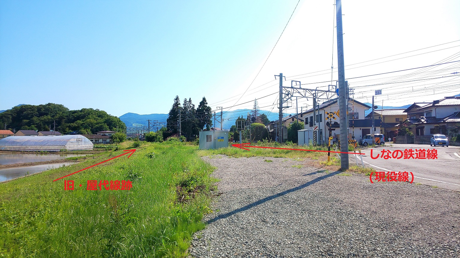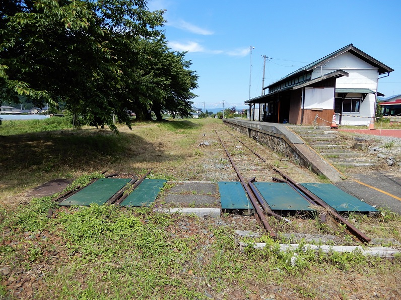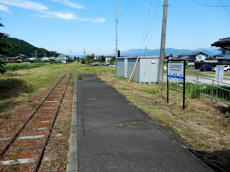 さらに東屋代駅跡を過ぎると、路盤は現役のしなの鉄道線と合流し、そのままゴールの屋代駅へと入っていきます。なお、松代と屋代の間にもいくつかの駅(象山口駅、岩野駅、雨宮駅、東屋代駅)がありましたが、いずれも駅舎は取り壊されてしまっており、現在では駅を思わせるような遺構はほとんど残っていませんでした。