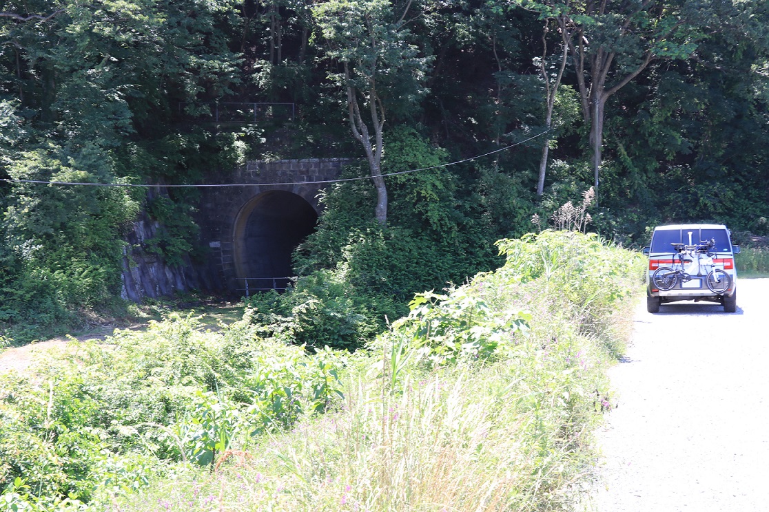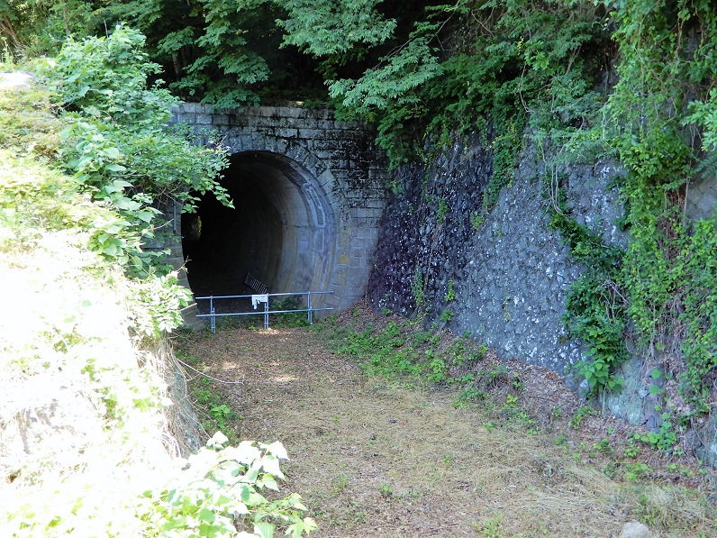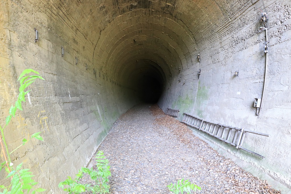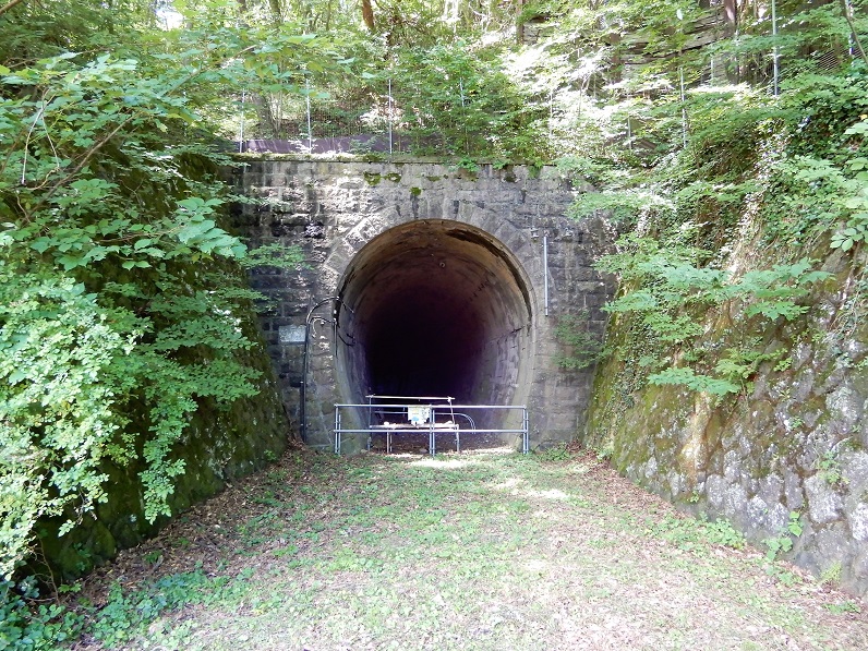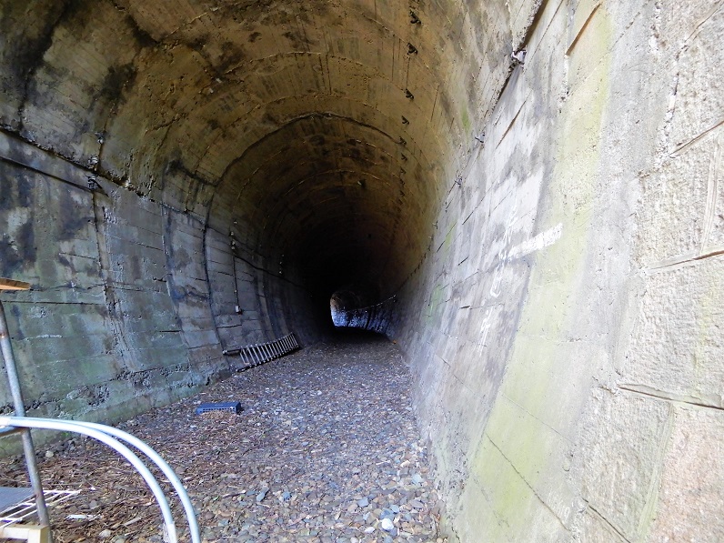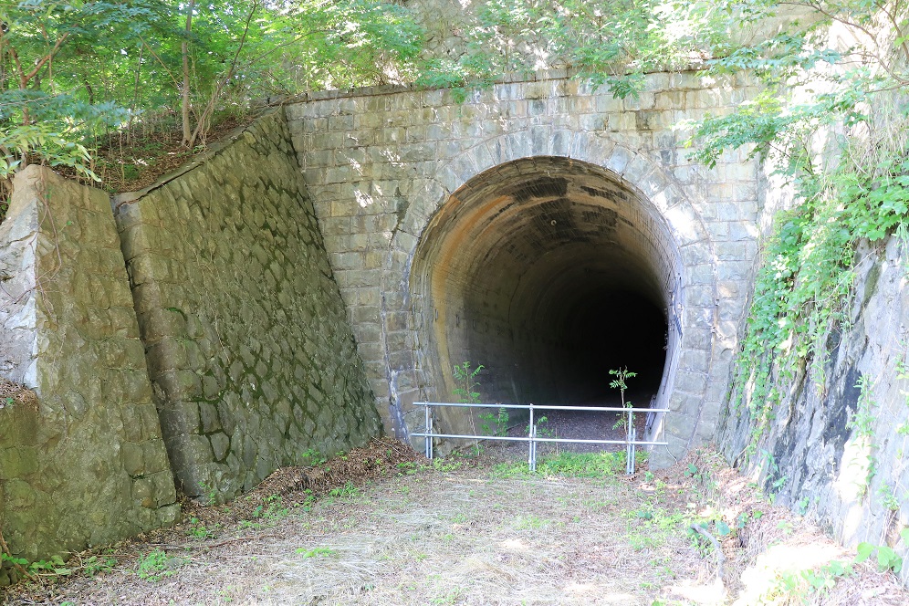 トンネルは石造りの坑門が重厚な印象です。中を覗いてみると、内部でカーブしているためか、出口は直接見ることができません。奥の方にうっすらと出口の光が壁面に反射しているのが見えるので、それほど長いトンネルではないようです。内部は崩落はもちろん、ゴミや落ち葉の堆積などもほとんどなく、線路さえ引き直せばすぐにでも利用できそうな感じがするほどきれいに保たれています。