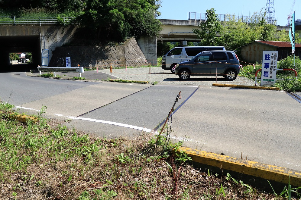 松代駅を出て次なる探訪地は、「北山隧道」跡です。ここは国道403号線から千曲市道5262号線に入ってすぐの場所にあるトンネルです。須坂方面から来た電車はこの北山隧道を抜けるとすぐに市道5262号線を踏切で通過し、鳴海排水機場脇にかかる鉄橋を越えていました。この場所はトンネル、踏切跡、鉄橋と3種類の遺構を見ることができる場所になっていますが、踏切と鉄橋の間は私有地の駐車場になっているため、立ち入りはしませんでした。