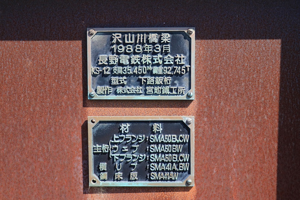 その後、屋代線は千曲川支流の三滝川に沿って南下し、少し行くとその三滝川を鉄橋で渡ります。これが「沢山川橋梁」跡で、見どころのひとつです。橋の周囲は護岸工事がなされて綺麗になっているのですが、この鉄橋だけがぽつんとそのまま残されていて異様な雰囲気を漂わせています。